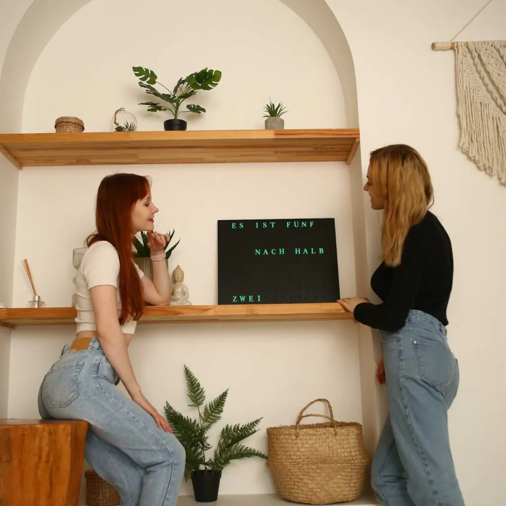 Eine geräuschlose Wanduhr ermöglicht Zeitbewusstsein, ohne Gespräche oder Ruhe zu unterbrechen. Die WordClock fügt visuelles Interesse hinzu und bleibt akustisch neutral.